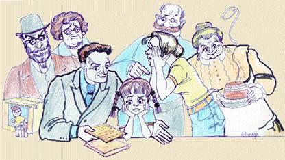 Приходит к молодым в гости абрашин дедушка и садится за стол в шляпе. Дашенька смотрит и не может понять, почему надо пить чай, как на вокзале, в головном уборе. Но молчит.