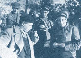 «Илья Эренбург». Рис. Ю. Анненкова. / И. Эренбург среди еврейских партизан в Вильнюсе, 1944 год. / И. Эренбург среди выдающихся деятелей еврейской культуры. Москва, 1941 год.