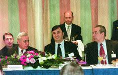 Затем кортеж президента направился в отель «Ренессанс» (бывший «Олимпик Пента»), где на четвертом этаже собрались предприниматели России, Израиля и других стран. Хотя завтрак с президентом был назначен на 12.45, уже в полдень почти все гости были в сборе. Перед входом в зал приемов сотрудники службы безопасности обеих стран демонстрировали профессионализм и решали судьбы журналистов: кого допустить поближе, а кому ограничиться лицезрением участников в кулуарах. Степенно прохаживался Аркадий Вольский, глубоким баритоном заставлявший звенеть хрусталь на подносах пробегающих официантов. Леви Леваев, как всегда уверенный, сдержанный, обсуждал с коллегами очередные текущие проблемы. Татьяна Парамонова толковала журналистам что-то про инфляцию. Бизнесмены России, Израиля, Азербайджана, Грузии, Украины проходили под аркой металлоконтроля и рассаживались за круглые столы по 6-8 человек. Ровно в 12.45 по длинному коридору пронеслось: «Приехали». Молодые люди, похожие друг на друга бритыми затылками, с динамиками радиотелефонов в ушах мгновенно рассредоточились, заняв исходные позиции.