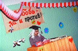 В вестибюле порхают бабочки, цветут цветы, висят гирлянды... Почти под потолком на монументальном возвышении сидит очень важный Леня Ройзен и изображает «судью». В каждом коллективе есть своя «творческая звезда». У нас это Леня – кладезь идей, артистичный, подвижный.