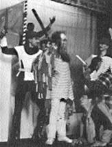 В качестве реквизита использовалось все, что попадалось под руку: деревяшки, куски материи, бочки, даже консервные банки. Декорации рисовали сами.