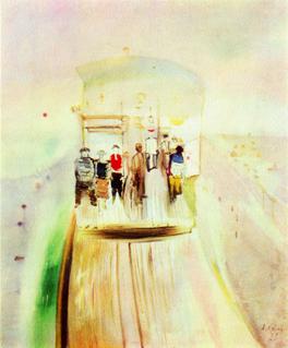 Его картина «В кабине аэроплана», кажется, объехала весь мир. Люди, сидящие в креслах, парят в безвоздушном пространстве, как будто их ввергло в состояние невесомости. Космичность всегда сопровождала живопись Александра Лабаса, была не только ее спутницей, но и неотъемлемой составной частью.