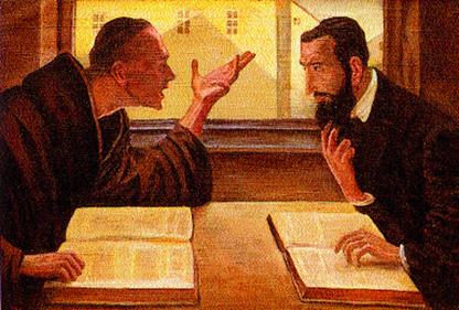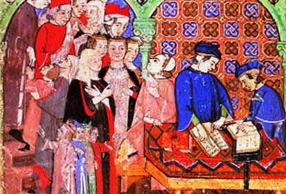 Альфонсо Х. «Кантигас де Санта Мария». Кантига 108: Мерлин спорит с еврейским ученым. Несмотря на симпатию короля мудрецов к евреям его труды не избежали всех антиеврейских предрассудков христианского мира: евреи представлены врагами христианства, учениками дьявола, воплощением жадности и коварства. Кастилия, XIII век.