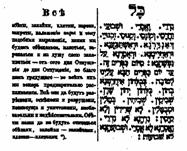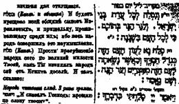 Странно и удивительно. Ведь только невежда не знает, что главное требование к кошерности мяса в том, чтобы оно принадлежало животному, смерть которого наступила внезапно и мгновенно, чтобы животное не страдало, чтобы оно не успело даже испугаться. Ибо только в этом случае в мясе не будет вредных для здоровья веществ, которые выделяются при страдании и даже при испуге. И, конечно, мясо должно быть обескровлено, ибо в крови – душа. Проскользнула мысль – как повезло евреям, что коррида – убийство быков, убийство как зрелище, именно колющими орудиями – является частью испанской, а не иудейской культуры. Вот когда удалось бы на славу потешиться борцам с еврейской жестокостью. А уж коль коррида – принадлежность христианского народа, то и забыть можно. Но еще больше возмущает г-на Мельского иудаизм, согласно канонам которого «...иудею разрешается ... лгать акуму (по Мельскому – любой нееврей. – Л.Ф.), а также приносить перед судом ложную присягу и клятву .., ибо согласно их верованию Ие-го-ва ежегодно в день праздника “Иом Купир” (так назван он Мельским. – Л.Ф.) расторгает и делает недействительными все клятвы, данные за истекший год сынами избранного им народа». Так полагает г-н Мельский и продолжает: «Вот текст поющейся в этот день молитвы “Коль – нидро”, занимающей одно из центральных мест в иудейском религиозном культе: “Во всех обетах, отречениях... также во всех клятвах, дня примирения до следующего дня примирения, который да настанет на наше благо, – мы сим каемся во всем. Да будут все они расторгнуты, бессильны, недействительными, сняты с нас и уничтожены навеки. Да не будут наши обещания – обетами; от чего мы отреклись, да не будут отречениями; в чем клянемся, да не будут клятвами”. Совершенно беспримерный случай религиозного допущения (если не оправдания) того, что нееврейским сознанием осуждается, как тягчайший грех клятвопреступления!» (выделено Мельским. – Л.Ф.) Что ж, проверим и убедимся, что и в этом случае г-н Мельский, мягко говоря, ошибся. Для начала проверим эту молитву “Кол Нидрей” по русско-ивритскому молитвеннику 1897 года, напечатанному еще с ятями и твердым знаком. Текст дается на обоих языках.