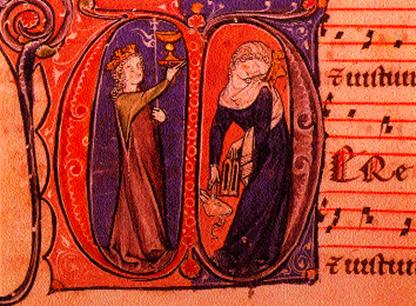Служебник аббатства Сент-Пьерр. Гент. Аллегории Церкви и Синагоги. Одной из форм антиеврейской церковной пропаганды в XI веке были аллегорические картинки, на которых церковь изображалась величественной коронованной девой, держащей знамя и чашу. Синагога же имела вид неопрятной старухи с уродливым лицом и съехавшей набок короной, с закрытыми или завязанными глазами, что означало «слепоту евреев». В руках старухи были скрижали Закона, сломанный скипетр или голова какого-нибудь животного (в данном случае – козла, символизирующего дьявола). Подобные образы распространялись по всей Европе и воплощались в скульптуре, живописи и церковных витражах, а также встречались на обложках и в иллюстрациях Библии и молитвенников.