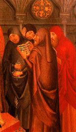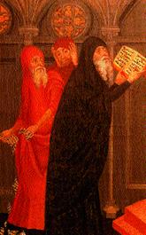 Хайме Серра. Фрагменты росписи алтаря Св. Стефана. Евреи слушают в синагоге проповедь святого. В христианской традиции изображения евреев намеренно искажались, чтобы и их одеяния, и черты лица определяли характеры. Именно из мастерской Серры, прежде сохранявшего нейтралитет в этом плане, появились первые произведения каталонской живописи, рисовавшие вероломство евреев: зловещие выражения лиц показывают их дьявольскую природу. Каталония, XIV век.