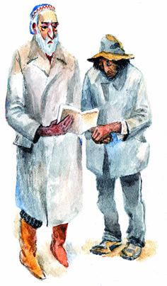 Но тут он от мыслей отвлекается, потому что степенно и величаво входит гость не в галошах, а в каких-то невиданных коричневых сапожках. Это высокий осанистый старик, своей громадностью сразу напомнивший отца. Все на вошедшего удивленно косятся, а он, ни с кем не здороваясь, подготавливается к молитве и одиноко в нее погружается. Откуда он взялся, как отыскал, где молятся, никто так потом и не узнал. Старик не говорил по-нашему и не понимал нас, а мы не понимали его – потому что на вопросы он отвечал на своем среднеазиатском языке, сам, по-видимому, будучи из тамошних краев, и – бородатый, громадный, благочестивый (наши-то – мы же знали, кто они на каждый день!) – был, как отрасль библейского древа.