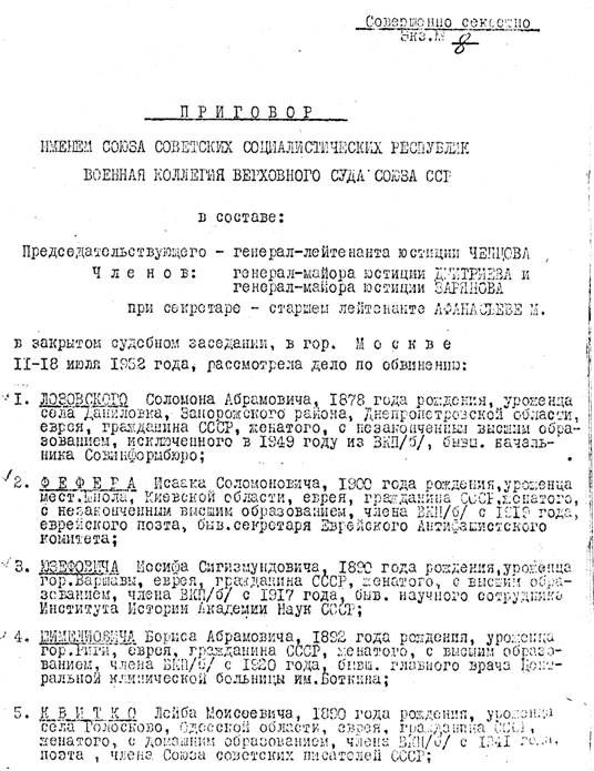 «Бюро Совета Министров СССР поручает Министерству Государственной Безопасности СССР немедля распустить Еврейский антифашистский комитет, так как, как показывают факты, этот Комитет является центром антисоветской пропаганды и регулярно поставляет антисоветскую информацию органам иностранной разведки.