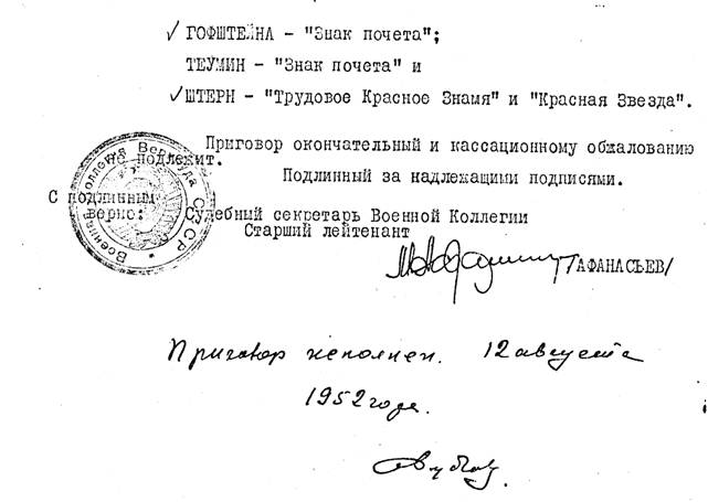К началу весны 1952 года следствие было завершено, а 5 марта было официально оформлено объединение дел по обвинению Лозовского, Фефера, Брегмана, Юзефовича, Шимелиовича, Штерн, Квитко, Маркиша, Бергельсона, Гофштейна, Теумина, Ватенберга, Зускина, Ватенберг-Островской, Тальми в общее производство. Предпринятая группой следователей попытка предотвратить привлечение трех последних к объединенному делу (по причине их полной непричастности к руководству ЕАК) была решительно отвергнута Рюминым. 31 марта он утвердил подготовленное Гришаевым обвинительное заключение, в котором деятельность 15 арестованных квалифицировалась как контрреволюционное преступление против государства, выразившееся в осуществлении шпионской работы, а также развертывании широкой пропаганды буржуазного национализма среди еврейского населения СССР. Сам процесс проходил с 8 мая по 18 июля 1952 года. По сути, он носил формальный характер, так как приговор был заранее «апробирован» Сталиным. Направленные приговоренными в Президиум Верховного совета СССР прошения о помиловании 7 августа были отклонены политбюро8.