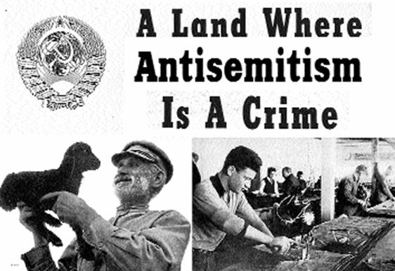 Надпись гласит: «Страна, где антисемитизм является преступлением». (Из журнала, изданного в Нью-Йорке в 1943 году по случаю приезда Михоэлса).