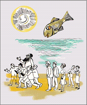 Слова Гронама конечно же были для Хелма законом. Пятеро мудрецов отыскали самый большой в Хелме чан, наполнили его свежей водой и выпустили туда преступника-карпа, накидав ему хлебных крошек, кусочков халы и прочих лакомств, которые могли прийтись карпу по вкусу. Шлемиля, телохранителя Гронама, поставили у чана, чтобы никакая жадная домохозяйка не сделала из заключенного гефилте фиш.