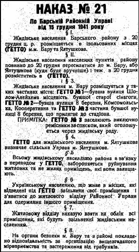В Баре появились военная комендатура, полевая жандармерия и местная власть – городская управа во главе с бывшим школьным учителем рисования, когда-то тихим и незаметным человечком. Местные полицаи ходили в гражданской одежде и на левом рукаве носили белую повязку с надписью по-немецки: «Шуцман». Евреев заставили на спине и груди носить желтые лоскуты. Их пока не убивали, но стали гонять на принудительные работы. Забирали все – от денег до мебели и постельного белья. Питались ограбленные евреи тем, что обменивали оставшееся имущество у крестьян на продукты, чтобы не умереть с голоду. Сердобольные местные жители тайком совали евреям что-нибудь съестное... В обращение ввели окупационные марки и ... советские рубли – десять рублей за одну марку. Рациональные немцы быстро запустили находившиеся в городе заводы, оставили в неприкосновенности колхозы, отбирая для нужд рейха весь урожай. Евреи облагались поборами, была введена трудовая повинность – все осуществлялось через созданные в каждом городе еврейские советы – юденраты. Во главе юденрата Бара стоял бывший слесарь по прозвищу Петлюра.