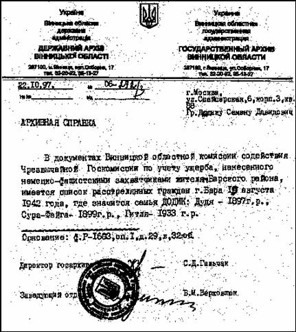 По партизанской справке Семен на попутной военной машине добрался до Бара. На месте бывшего дома Додиков оказались руины. Сема зашел в гетто, все еще окруженное колючей проволокой, и долго стоял в комнате, ставшей последним пристанищем его родным...