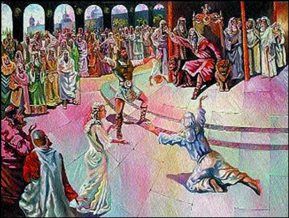 Соломон, повторив утверждения каждой из них, велел принести меч. Поскольку свидетелей не было и ни одна из женщин не могла доказать своей правоты, царь, словно речь шла об имуществе, велел рассечь и живого, и мертвого ребенка пополам и отдать каждой женищине по половине живого и мертвого ребенка.