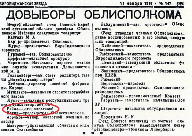 ...В марте 1936 года отца вызвали в ЦК ВКП(б). Ему сообщают, что он мобилизован на руководящую партийную работу в ЕАО. Путевку выдал секретарь ЦК Андреев. Отец должен был создать еврейскую писательскую организацию и возглавить ее. Тогда же было решено строить в Биробиджане дом для писателей и артистов. За год его построили, и писатели получили квартиры. Отец тоже привез свою семью в новую квартиру.