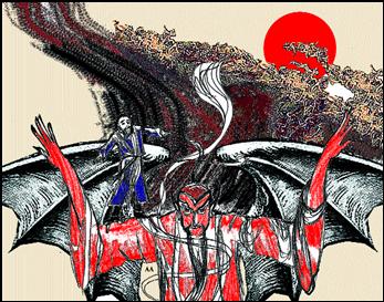 Асмодей дрожит как в лихорадке. То свертывается клубком, то с резким свистом выпрямляется, растягиваясь в пространстве на немыслимую длину. Потом вдруг останавливается и, паря в воздухе, гордо подняв голову, грозит кулаком, дерзновенно возвышает голос: