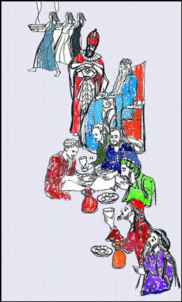 Пышное торжество происходило в огромном зале. Для приема небывало важных гостей и хозяин, и челядь потрудились на славу. Стол украшали роскошные приборы из золота и серебра, воистину бесценные. Уникальность их объяснялась, впрочем, не только драгоценными металлами, из которых сотворили их мастера, но, не в последнюю очередь, и изяществом формы, отделки, являвшими собой образцы истинного искусства. Особенно радовали взор греческие золотые кубки, создания известных художников, и серебряные сосуды для омовений; филигранная резьба восхищала даже весьма строгих и пристрастных ценителей. Слуги расставили повсюду высокие вазы с цветами изумительной красоты. Тонкий аромат роз и лилий разносился по всему залу. С потолка на цепях свисали огромные светильники, их абажуры из дорогого стекла переливались множеством оттенков.
