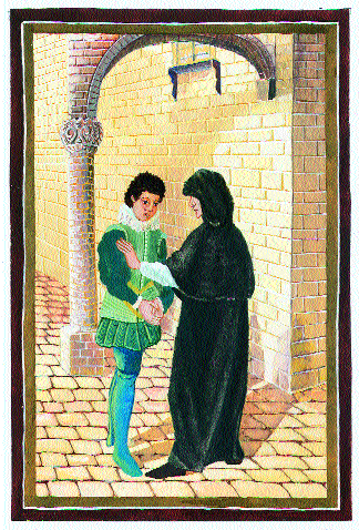 В эту ночь Хуан Помас не спал. Он шел в темноте, ведя под уздцы своего коня. Потом привязал его к сухому дереву, а сам сел на камень, размышлял, проклинал себя и даже плакал. И так просидел несколько часов кряду, пока не услышал крик петуха – только тогда он сел на коня и поскакал во тьму. Ближе к рассвету тьма постепенно рассеялась, вдали зазвонили монастырские колокола. Хуан Помас направил коня прямо на этот звон.