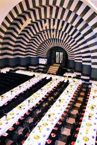 Банкетный зал был украшен праздничными гирляндами, на стенах тематические