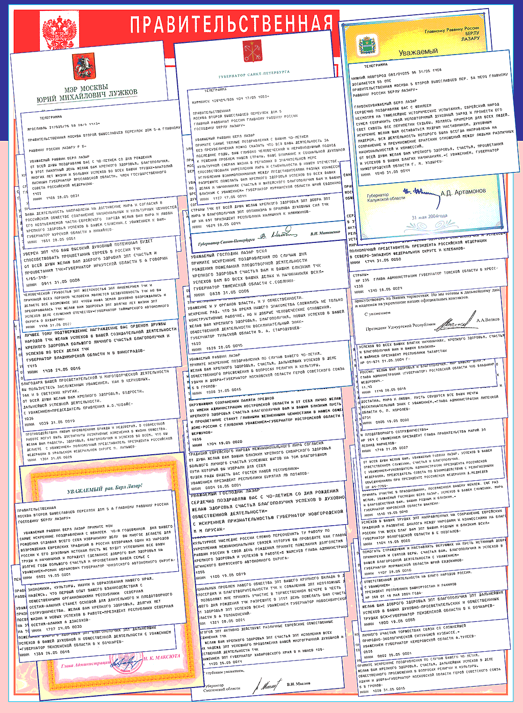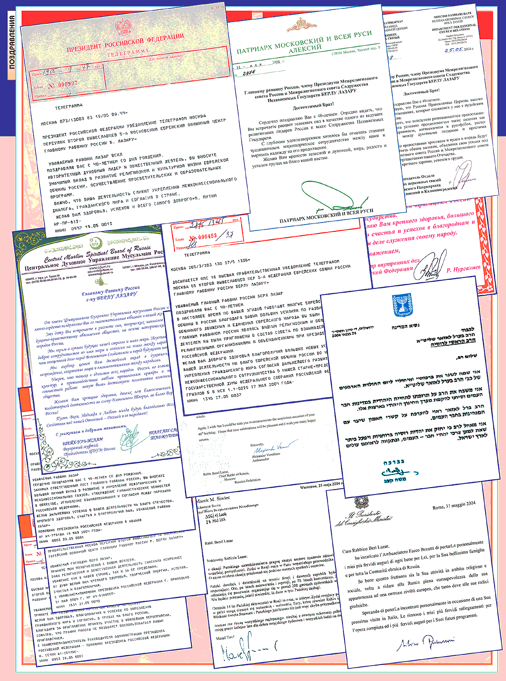 Телеграммы приходили и из «дальнего зарубежья», что свидетельствует о высоком международном авторитете духовного лидера евреев России. Так, председатель Еврокомиссии Романо Проди в своем поздравлении вспоминал встречи и беседы с раввином Лазаром на различных международных форумах, которые помогли ему лучше понять современные процессы в Российской Федерации. А министр по делам Иерусалима и диаспоры в правительстве Израиля в своем письме подчеркнул, что Берл Лазар играет центральную роль в «великом процессе возрождения евреев, гордых своим еврейством». «Ваш пост главного раввина России требует не только глубоких познаний в Торе, но и больших дипломатических способностей. Ведь именно Вы представляете общину евреев России в переговорах с властями, Вы разрешаете проблемы и разногласия, и – что, возможно, самое главное – Вы проявляете заботу о каждой семье, о каждом члене общины. И эту столь сложную функцию Вы исполняете талантливо и с успехом», – подчеркнул Натан Щаранский.