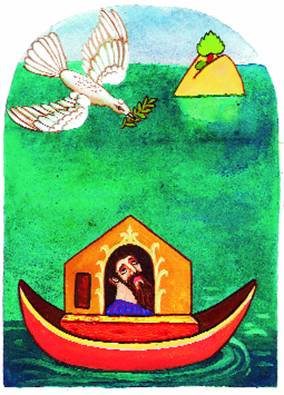 Тогда Ноах отправил на разведку голубя. Голубь взмыл в небо, потом вернулся. Через несколько дней сделал Ноах еще одну попытку. Прилетел голубь обратно, сел к нему на плечо с веточкой оливы.