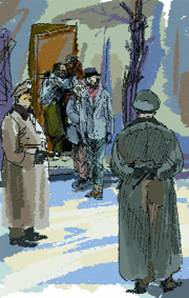 Наступила тишина. Только электрические провода звенели в морозном воздухе. Сумасшедшие слились в одну черную массу, и их глаза слились в один огромный глаз, в котором можно было прочесть всю историю еврейского народа. И герр майор вычитал из этой истории самые мрачные страницы.