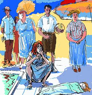 Он немного знал девочку: они с матерью сидели в столовой неподалеку. Однажды он сказал Норме, что девочка прелестна. Ее смерть, вопли матери (сомкнутые ладони, беспорядочно метавшиеся взад-вперед – как у игрока, готовящегося бросить кости) напугали его. Он возвращался, держа в руке ракетку, с теннисного корта. И уперся в обгоревшие на солнце спины. Помогая себе ракеткой, он протиснулся вперед. Но, оказавшись во внутреннем кольце круга, увидев синее лицо девочки, обрамленное мокрыми светлыми прядями, отступил, поднес ракетку к лицу, загородив глаза. Люди, напиравшие сзади, не пропускали его, и ему пришлось смотреть, как миссис Голдстоун, мать девочки, сначала спрашивает у всех, как это могло случиться, потом молит, потом проклинает и наконец наклоняется к девочке и бьет ее по щекам. Он слышал, как она с мнимым спокойствием вконец обезумевшего человека, твердит мертвой девочке: «Просыпайся! Просыпайся! Просыпайся!» Он наблюдал за матерью – она нависла над девочкой, было в этом нечто непристойное – она напоминала человека, присевшего испражниться в кустах. Мать отчаянно боролась с пожарными, пришедшими забрать девочку, а когда они унесли нелепо подпрыгивавшее на носилках тело, он видел, как она пытается обнять мокрый отпечаток тела на бетоне. Когда из толпы к ней потянулись руки – ее пытались утешить, окружили ее, хотели выразить ей сочувствие, он отвел взгляд.