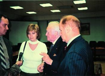 Морис Дрюон (второй справа) дает интервью еврейской радиопрограмме Оренбургского еврейского культурного центра.