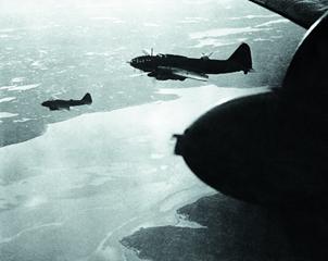 Вместе со звуками марша один за другим оставляют взлетную полосу акулообразные самолеты. Впереди вырисовывается море. Буднично спокойное, оно лениво катит волны, легко различимые сквозь стеклянный пол штурманской кабины. Прошло ощущение скорости. Чудилось, бомбардировщик застыл в бескрайней голубизне воздуха. Сдвинув каску на затылок, штурман с благодарностью подумал о Жоре Блудареве. Парень хотел лететь с ними стрелком-радистом. Но не разрешили. А на него положиться можно. Достаточно вспомнить, как он спас самолет с ранеными, когда возвращался от партизан на Большую Землю… Шика Корданский тоже вытащил ребят с того света – весь свой экипаж. Сам ранен, в самолете две сотни пробоин, и ничего – дотянул до аэродрома... Невзначай вспомнив об однокашнике, с которым вместе учился в Ейской военной школе морских летчиков и впоследствии попал в 36-й авиационный полк, он посмотрел вперед – туда, где в авангарде шел его самолет.