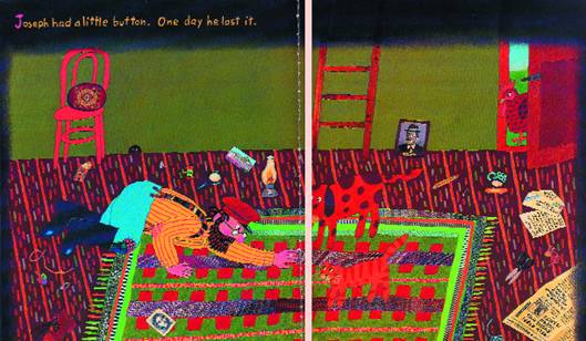 Интересное расхождение книжки с песней – добавление сквозного эпитета «маленький»: все вещи Йосефа от пальто до пуговицы – «маленькие». «A littlе», наверное, следовало бы переводить уменьшительно-ласкательным суффиксом: «пальтишко» («пальтецо»), «пиджачок», «жилеточка», «шарфик», «галстучек», «платочек», «пуговичка». А может, и нет: ведь «маленький» – составная часть рефрена каждого эпизода: «У Йосефа был маленький».