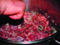 Шеф-повар мясного ресторана «Йона» начинает приготовление кисло-сладкого мяса с того, что разогревает в хромированной кастрюле подсолнечное масло до 100 градусов и в кипящее масло бросает мелко нарезанный репчатый лук. При помешивании лук обжаривается в течение 10–15 минут, до золотистого цвета. Далее в кастрюлю кладут мясо, нарезанное ломтиками, и накрывают крышкой. В течение 20 минут оно должно пустить сок, после чего лук «растворяется» и придает мясу насыщенный цвет. В кастрюлю добавляют воды и продолжают тушить. Через час добавляют стручковую корицу, чернослив, мелко нарубленный чеснок. Когда мясо приобретает светло-коричневый цвет, делают очень слабый огонь. А через полтора часа, когда мясо становится мягким, в кастрюлю добавляют соль, сахар, лимонную кислоту. Перед готовностью размачивают хлеб, мелко крошат в соус, размешивают. В течение 5–6 минут, соединяясь с хлебом, соус становится густым. В последнюю очередь добавляют черный перец и гвоздику. (Если, попробовав, вы решите, что лимонной кислоты больше чем нужно, добавьте столовую ложку меда или сахар по вкусу.) Приготовленное блюдо не перемешивая перекладывают в чугунок (стручки корицы при этом можно вынуть), ставят в духовой шкаф и «доводят» 25 минут при температуре 180 градусов. При отсутствии чугунка мясо можно поставить в духовку в той же кастрюле. Весь процесс приготовления блюда занимает 3–3,5 часа.