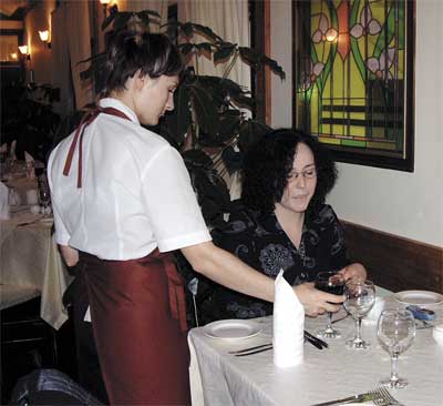 Каменный пол «одет» ламинатом цвета темного дерева. Широкий плинтус и «отбивная» доска, опоясывающая стены на высоте метра от пола, покрыты тонированным лаком. Обновлена барная стойка. На потолке над нею подвешены балки, имитирующие перекрытия средневекового трактира, а декоративные решетки между фрамугами светового фонаря задают определенный зрительный ритм. На окнах с внутренней стороны появились витражи с цветочным орнаментом. В том же «растительном» стиле выдержаны новые люстры и бра. И – заключительный штрих – возле двери, ведущей в банкетный зал, медленно вращается подсвеченная витрина с пирожными.