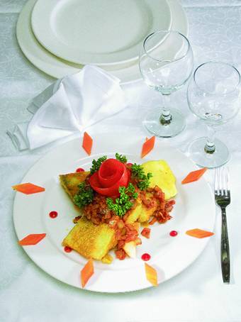 – Сначала в подсолнечном масле обжариваем до золотистого цвета мелко нарезанный лук. Затем очищаем помидоры от кожицы, режем кубиками и смешиваем с пассированным луком. Сюда же кладем шинкованные свежие грибы. Будущий соус тушится до десяти минут. Снимаем его с огня, добавляем томатную пасту, оливки без косточек, лавровый лист, соль и душистый перец. Размешиваем, проверяем вкусовые качества, накрываем, чтобы не остыл. Соус у нас готов. После этого берем филе судака, панируем его в муке, обжариваем с обеих сторон при температуре 180 градусов. В этом же масле, после того как рыбу убрали со сковородки, обжаривается белый хлеб затейливой формы: я обычно вырезаю для этого блюда плоский кусочек в форме сердца.