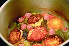 готовности картофеля и мяса, выкладываем в эту же кастрюлю оладьи, добавляем