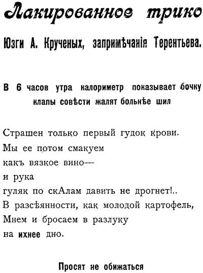 Всё сказанное так и осталось бы игрой ума, если бы в 1919 году Алексей Крученых и другой замечательный авангардист Игорь Терентьев не оказались в относительно мирном Тифлисе и не основали группу «Кампания 41°», издавшую сборник «Лакированное трико». Уже на первой странице этого сборника читаем: