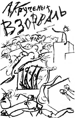 Впрочем, это не мешает нам обратить внимание на отражение дела Бейлиса в произведениях русских авангардистов. Прежде всего, обратим внимание на сочиненные Алексеем Крученых «стихи на еврейском языке», опубликованные в сборнике «Взорваль». Это, как нетрудно видеть, всего лишь одно слово – «ШИШ». Ничего еврейского в этом слове нет, за исключением шрифта его написания. Причем даже само происхождение рисунка в сборнике Крученых вызывает споры. То ли это стилизованный восьмисвечник на еврейский праздник Ханука, то ли движения еврейского танца, сочетающего в себе веселье и грусть[6].