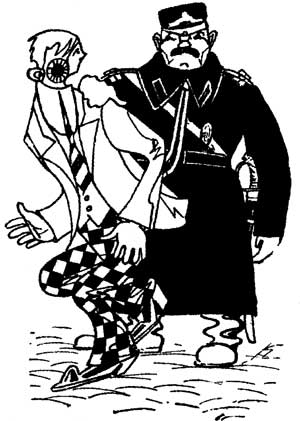 В бессодержательном комментарии к этому тексту и тексту Хлебникова[11] нет ничего конкретного, связанного с реальным содержанием пародии Крученых. Например, с теми обстоятельствами, что отец К. И. Чуковского был евреем, а сам К. Чуковский начинал свою публицистическую и критическую деятельность в одесской русско-еврейской печати вместе с В. Жаботинским. Или что Чуковский был инициатором знаменитой дискуссии о евреях и русской литературе. Тексты на эту тему В. Жаботинский переиздал в книге «Фельетоны» в 1913 году. Поэтому именование строгого критика футуристов «приставом», проводящим некую «чистку», относится не к будущей советской «чистке поэтов», а к выселению приставами евреев, не имеющих права жительства, из столичных городов. Поэтому знаковая для 1913 года «швайка», которую Чуковский «достает» из бандитского или провокаторского сапога «пристава», вполне соответствует обстановке года «бейлисиады», с ее шилами, швайками, числом 13, провокаторами, убийцами, приставами и лжесвидетелями, с которыми сравнивается в пародии автора «Дыр бул щыл» «пристав Чуковский». Пристав носатый, прыткий и при этом неистовый. Можно сказать, что хитрый Алексей Крученых, уже заставивший, по воспоминаниям Б. Лившица, поскользнуться К. Чуковского «на навозной куче» своих стихов, вновь оказался победителем в сражении с одним из популярнейших критиков своего времени.