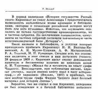 Речь шла о короткой цитате из письма Н.М. Карамзина А.И. Тургеневу («Желал бы я взглянуть на книгу графа Чацкого»), которую я сопроводил указанием, что при публикации письма (в «Русской старине») адресат уточнил, какую именно книгу имел в виду историограф – «О евреях» (Вильно, 1807), – и подстрочным примечанием на языке оригинала, где привел выходные данные этой работы Чацкого, не публиковавшейся по-русски.