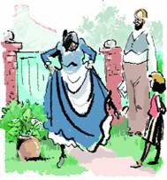 Она руки сложила на белом фартуке, а тот был на черном фартуке, стоит и смотрит прямо на него.