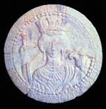 Богиня Тюхэ с рогом изобилия и в диадеме, имеющей форму крепостной стены. Мраморный медальон из ранневизантийской церкви в Тиншемете, Израиль.