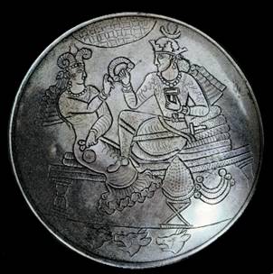 Серебряная чаша с изображением сасанидского царя в короне в виде крепостной стены, пирующего с царицей. VI–VII вв. н. э.