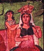 Царица Эстер восседает на троне позади царя Артаксеркса. На ее голове золотая корона в виде крепостной стены с тремя выступающими башнями. Синагога Дура Европос. Росписи западной стены.