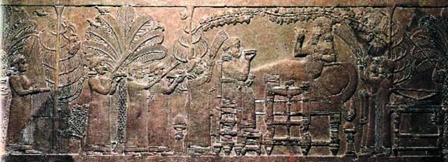 Ассирийский царь Ашшурбанипал и царица Либали-Шаррат празднуют победу над царем Элама в дворцовом саду. Ниневия, Северный дворец. VII в. до н. э.