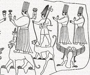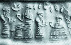 Оттиск эламской цилиндрической печати начала второго тысячелетия до н. э., изображающей бога и богиню пирующими под сенью беседки из виноградной лозы.