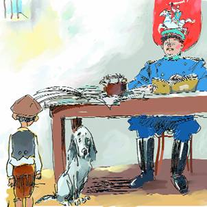 В комнате на стене висел герб Литвы, посреди стоял грубо сколоченный стол, заваленный бумагами, а под столом смирно сидела лохматая собака, вислоухая и совсем не злая.