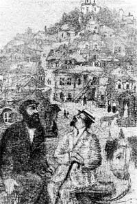 В художественном пространстве Каплана Тевье-молочник попадает в реальный мир и беседует со своим создателем Шолом-Алейхемом. А может быть, наоборот, Шолом-Алейхем становится героем своих произведений – литография так просто и называется: «Тевье беседует с Шолом-Алейхемом». Подобная легкость перемещения в условном мире вообще свойственна еврейскому художественному мышлению, достаточно вспомнить рассказы Башевиса Зингера или Агнона.