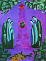 Интересным примером совмещения советских и еврейских реалий является масляное полотно «Памятник красноармейцу» (1976). Картина имеет как бы три уровня. На чердаке и в подвале – сценки из еврейской жизни: местечковые дома, козы, извозчик. А в центре небольшая стела с красной звездой. С обеих сторон памятника склонив головы стоят две еврейские пары в традиционных одеждах.