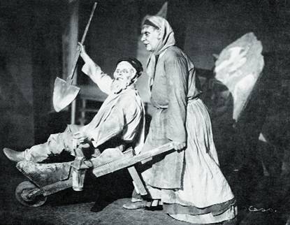 Премьера спектакля по Шолом-Алейхему возродила общественную дискуссию, начавшуюся за три года до этого, во время первых гастролей «Габимы» в Эрец-Исраэль. Тогда «Габима» выпустила другой спектакль по произведениям Шолом-Алейхема – «Клад» (1928) – в постановке известного российского режиссера Алексея Дикого. После премьеры «Амха» очень многие критики сравнивали эти два спектакля. Спектакль Дикого был воспринят местной критикой как чересчур «гротескный» и потому чуждый еврейскому зрителю, тогда как постановка «внутренних» режиссеров оценивалась как романтическая комедия, сочетающая элементы еврейского быта с элементами народной сказки. Гротеск действительно был важнейшим выразительным средством в спектаклях «Габимы» в первое десятилетие ее существования, хотя у каждого из крупных российских режиссеров, работавших с габимовцами, было свое понимание этого термина. Станиславский – «духовный отец» Библейской студии «Габима», давший ее актерам курс по своей системе и работавший с ними над спектаклем «Сон Иакова» по пьесе Р. Бер-Гофмана (Москва, 1925), – считал гротеск одним из средств внутренней характеристики персонажа[6]. Для Евгения Вахтангова – практического наставника «Габимы» в 1917–1922 годах – гротеск был не средством, а методом работы. По Вахтангову, на сцене все должно быть гротескно, что значит: театрально, заострено и гиперболизировано[7]. Именно Вахтангов в процессе работы над спектаклем «Гадибук» по С. Ан-скому создал особый театральный стиль «Габимы», отличавшийся яркой гротескностью. Понимание гротеска Диким было ближе к пониманию Вахтангова[8], чем Станиславского, с той разницей, что Дикий был склонен увлекаться внешней изобретательностью, тогда как для Вахтангова синтез внутреннего и внешнего был необходимым условием художественности. Как Вахтангов, так и Дикий использовали гротеск во многих своих постановках, а не только в работе с еврейскими актерами, но именно у габимовцев гротеск стал неотъемлемой частью их стиля, его отличительной чертой.