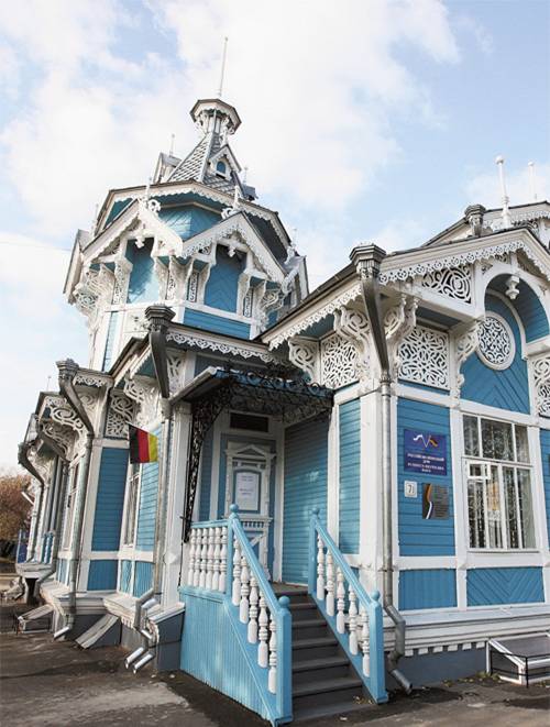 Вот потрясающий «дом с шатром» по улице Красноармейской, 71, – бело-голубой особняк, украшенный дивной деревянной резьбой, дом купца Голованова (1902). Сегодня в нем – немецкий культурный центр, что спасает здание от разрушения.