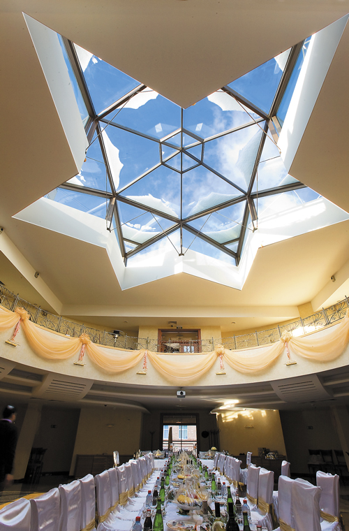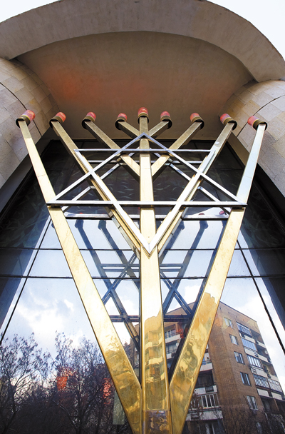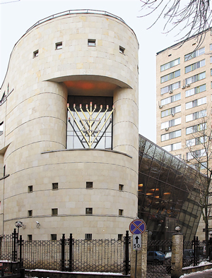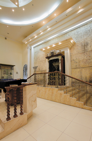 Главное, чем запоминается синагога на Бронной, – башня с большим окном и с ханукальным девятисвечником. Башня у здания слева, а основной фасад занимает наклонный стеклянный витраж. За ним – вестибюль, и в нем – второй фасад, как бы древний. За ним – уже молельный зал, восточная стена которого сделана из крупных, необработанных квадров камней, как будто перед нами фрагмент древнего сооружения. Это самый сильный акцент интерьера, колонны, обрамляющие восточную стену с двух сторон, выглядят как позднейшая пристройка.